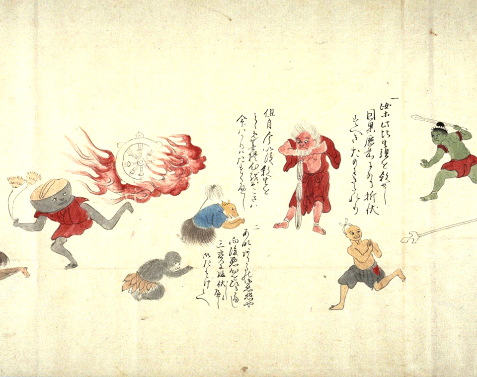室町時代に成立した「付喪神(つくもがみ)」の話を描いたもの。「付喪神」は、捨てられたことに腹を立て、妖物に変化した古道具たちが復讐を企てるも、最後には改心し、仏門での修行をへて成仏を果たす物語(所蔵・京都大学附属図書館)