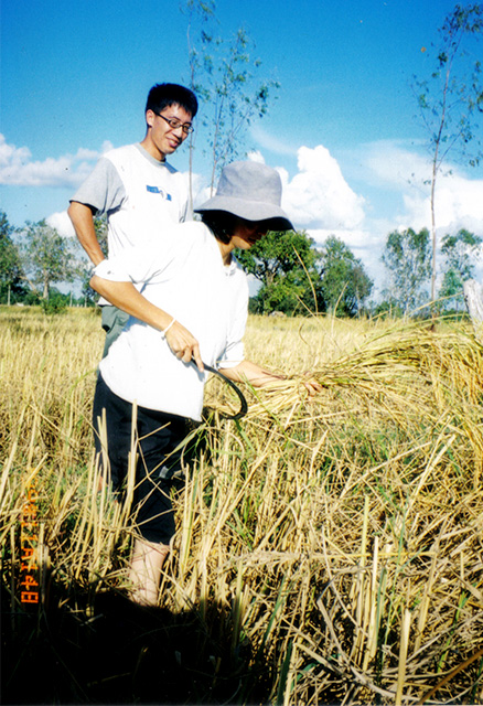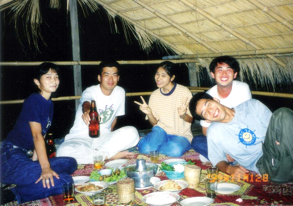 作物学研究室に所属し、収量調査の手伝いでタイに。研究室の同僚や先輩、地元の女の子と酒宴を開いた。左端が私