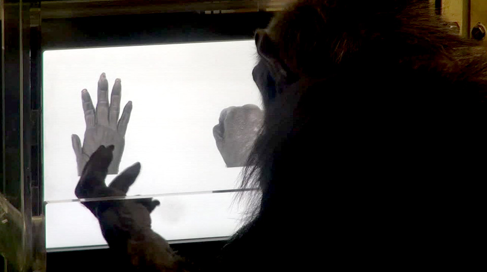 チンパンジーを観察していると、思いがけない発見があった。チンパンジーの手の画像ならグー、チョキ、パーを認識できるが、人間の手の画像では反応できない。私たちはチンパンジーの手を自分の体に置き換えてその動きをまねることができる。チンパンジーと人間とでは、身体の認識のしかたが異なるのではないか。そんな素朴な問いから、「チンパンジーは身体をどのように知覚するのか」という新たなテーマが生まれた。
