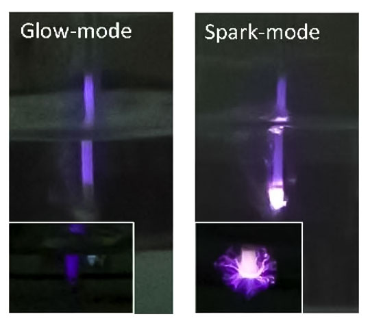 最後に一つ、我々が行っている研究を紹介します。このような実験装置を作製して❿、水中に導いた空気に高い電圧をかけていくと、プラズマを生成することができます。放電が開始すると、最初に、一様に紫色の光を発するプラズマが得られます。このプラズマはグロー放電のようなので、我々はこれをグロー・モードと呼んでいます。さらに高い電圧をかけていくと、より明るい火花が水中に飛び散るようになります。こちらのプラズマはスパーク・モードと呼んでいます。