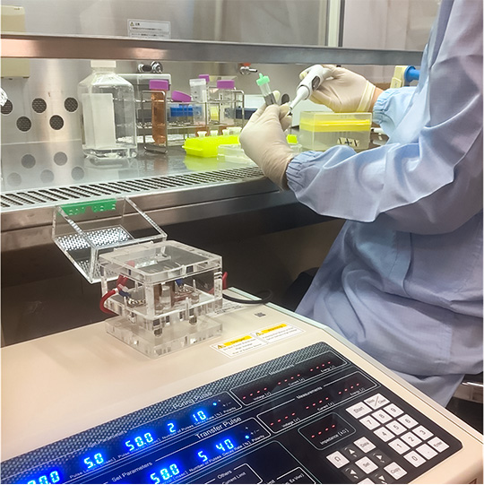 ヒトiPS細胞にゲノム編集を施している。手前の機材は遺伝子導入装置(写真提供・本田 充氏〈CiRA〉)