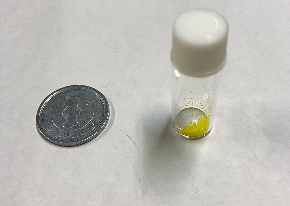 「一度の依頼につき、これくらいあれば〈たっぷり〉な量です」。坂田文恵さんが取り出したのは分析用のサンプル。(写真1)言葉とは裏腹に、小指ほどの大きさのサンプル瓶には黄色っぽい粉がほんの一つまみ。