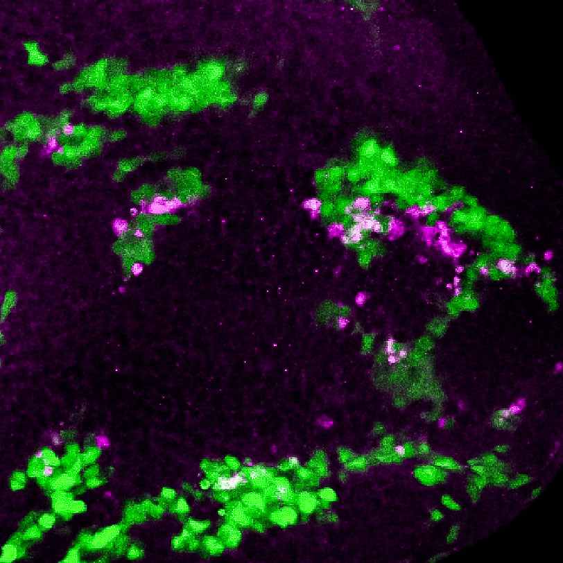 ショウジョウバエ複眼原基に正常細胞集団(黒い領域)と変異細胞集団(緑の領域)をモザイク状に誘導して細胞死(マゼンタの領域)を検出。正常細胞に近接する変異細胞では細胞競合によって細胞死が引き起こされ、組織から排除される