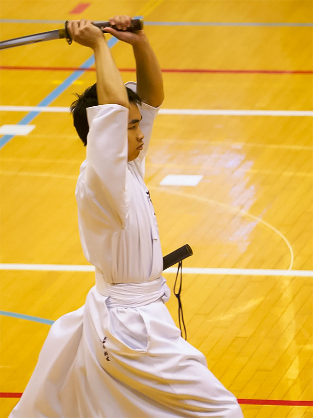 2019年の全日本学生居合道大会団体戦出場時の上松さん。敵を真っ向から切って倒す「切りおろし」という動作をしているところ。切りおろしでは、刀の動きの鋭さ、刀の軌道の正確さ、切る位置の正確さなどが重視される