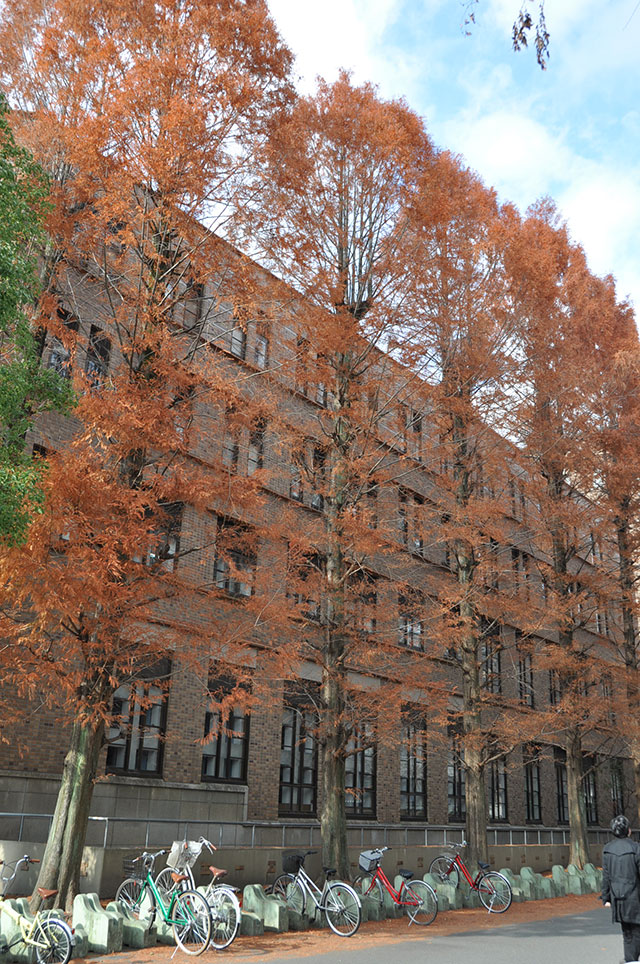 法経済学部本館の東側の壁に沿って、9本のメタセコイアが列をなす。幹は空に向かって真っ直ぐと伸び、葉色は四季折々に変化する。各地の公園や道路の並木で見られる身近な樹木だが、一時は絶滅の危機にあった。