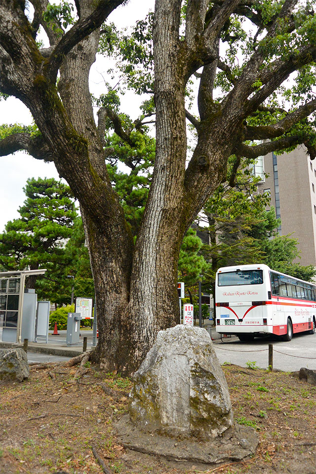 正門北東、自動車の入場ゲート付近のクスノキ(写真上)の根元には4つの石碑が残る。うち一つに刻まれるのは、1894年、第三高等中学校から第三高等学校への改組時の銘文。第三高等学校の発足当初は一部の専門学部のみが置かれたので、他の専門学部の学生は別の高等学校に移らざるを得なかった。石碑には、京都を去る学生たちの師友の別れの感慨と哀切が綴られている。「分袂式」では、石碑とともにクスノキの若木を植樹。当時は時計台近くの別の場所にあり、1945年に現在の場所に移転。このクスノキが初代のものかどうかは定かではない。
