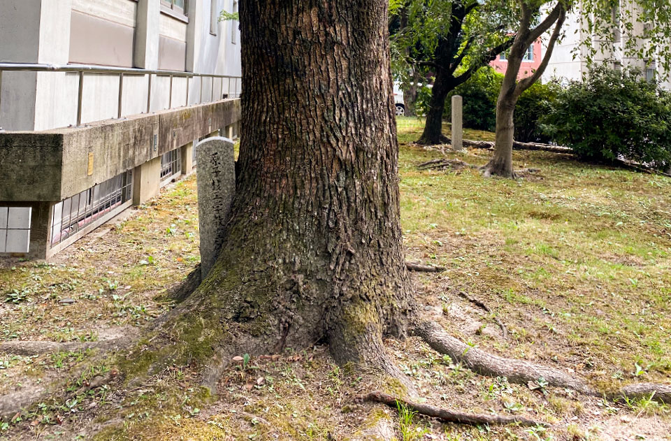 多くの記念樹と記念碑が現存する旧建築学教室本館の前、「第一回卒業生記(以下は埋もれて読み取れず)」と書かれた石碑の隣にクスノキが育つ。Ⓒ(写真左)1923年の設置と推定される。当初の予想以上に樹木が成長し、石碑の下部が根に埋まる。総合研究10号館の北西にも、クスノキの幹と根に埋もれた石碑が残る。