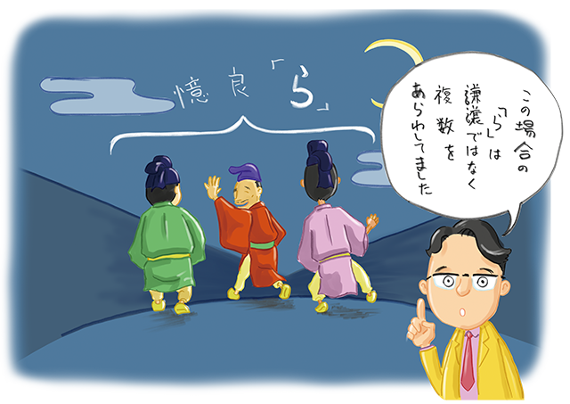 さて、この歌を文法面からみてみましょう。「憶良ら」の「ら」は複数を表す接尾語ですが、この歌では「謙譲の表現」だとされています。しかし、接尾語「ら」が固有名詞に接続して謙譲の意を表すのは事実上、この例だけ。やや議論のあるところです。