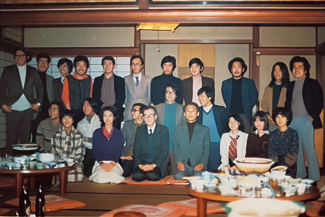 フランス留学前の仏文研究室コンパでの1枚。前列4人目の茶色いセーターを着ておられるのが中川先生。その左に座っておられるのは本城格先生(京都大学名誉教授)。後列右から5人目が多賀教授。左から4人目は人文科学研究所で活躍された大浦康介さん(京都大学名誉教授)、右から2人目がジャック・デリダ研究で知られる鵜飼哲さん(一橋大学名誉教授)。「中川先生の姿勢の良さが際立っています」。