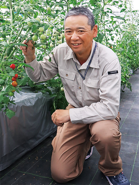 西川さんが「京てまり」と出会ったのは蔬菜班に移った20年前。栽培方法は現在ほど確立していなかった。開発を始めた矢澤進先生の「好きにしてみ」という言葉に背中を押され、他の蔬菜の栽培本で得た知識も試すなど、あらゆる方法に挑戦。一つ上手くいくと「ようがんばった」とほめてもらえたことが、次の課題に挑む原動力になった。「長年トマトに向き合っていると表情が見えてきます。私が育てるトマトはたいてい『水をくれ』という顔をする。私は『我慢せい』と返して、甘くなるように水やりは控えめにします(笑)。一瞬一瞬で変わるトマトの表情を見逃せない仕事です」。