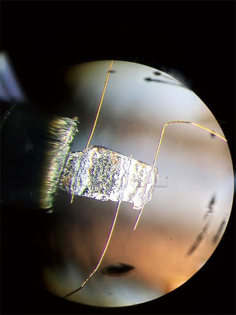 熱伝導測定。3本の金線をつないでいるのが結晶