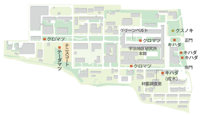 京都大学の誇る先端研究を推進する附置研究所が居を構える宇治キャンパス。宇治川の右岸に位置し、古くは水陸交通の要衝として国内外の船が集まった。付近には古墳や古社寺の点在する伝統あるこの地と京都大学との関係は、1947年に京都帝国大学木材研究所が研究活動を始めたことにさかのぼる。木材との関わりの深い宇治キャンパス内に生きる樹木から、宇治キャンパスの歴史をのぞいてみた。