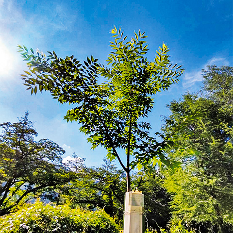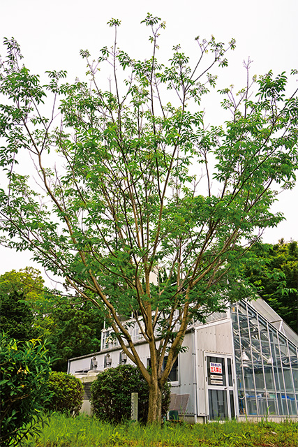 杉山:木質科学研究所の島田幹夫教授が2004年の退官時に、「黄檗なのにキハダが1本もない」と3本、寄付してくださいました。材鑑調査室の裏で元気に育つ成木は、そのうちの1本です。残りの2本は、2009年に広場に移植しましたが、風にさらされるなどで枯死。その後も何度かの育成失敗を経て、今はシェルターで保護しながら成長を見守っています。