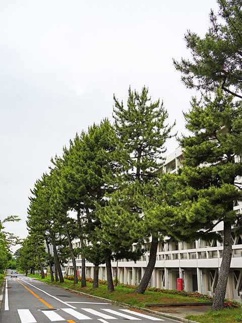 宇治地区研究所本館の南側には、クロマツが並ぶ。宇治キャンパスにはあちこちにクロマツが生えており、大きな存在感を放つ。