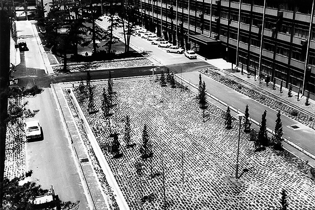 宇治構内の整備に伴い、ロの字型の宇治地区研究所本館の中央にはグリーンベルトを設置。クロマツやハナミズキ、シダレザクラなどが植えられた。(写真・京都大学大学文書館所蔵)