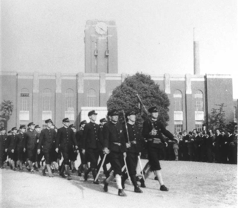 農学部グラウンドで壮行式を終え、行進する出陣学徒(1943年11月20日)(京都大学大学文書館所蔵)