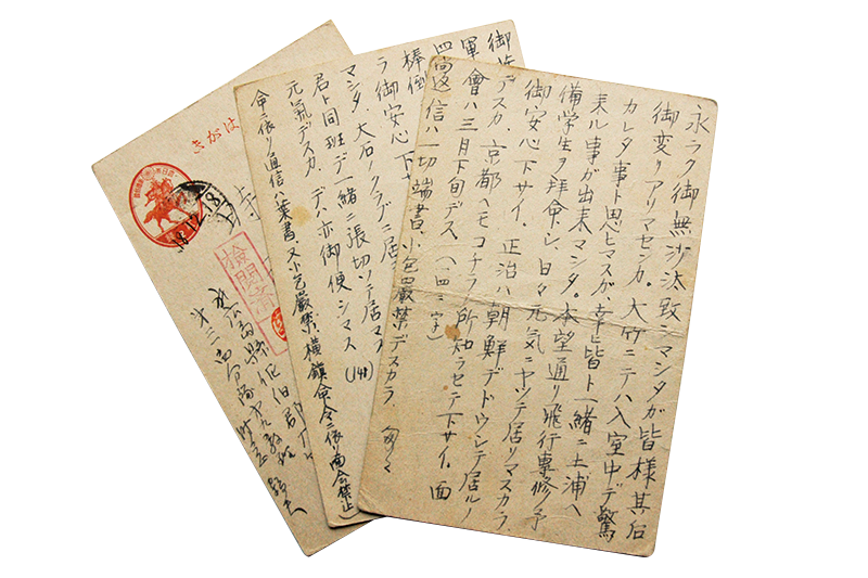 出陣学徒が基地から実家に送った葉書。全てに「検閲済」の朱印がある)(京都大学大学文書館所蔵)