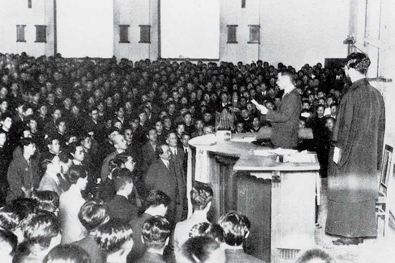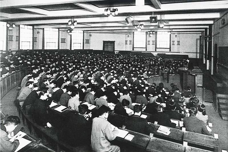 大学の本部機能を備えた時計台の1階には、法学部や経済学部の教室もあり、中でも半円形の法経第1教室は、当時の学内最大の規模で、講演会や学生大会にも使われた。