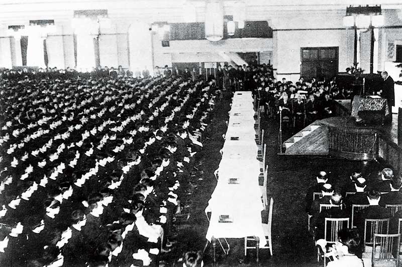 ② 設立当初は2階の大部分(ピンクの範囲)は大講堂であった。写真は1963年の入学生宣誓式