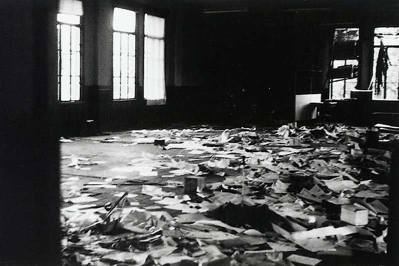 1960年代末期に日本各地で大学紛争が勃発。京都大学では、1969年1月16日の増寮問題を巡る総長団交決裂後の学生部封鎖に始まる。写真は、大学紛争の終結後に撮られた時計台1階の事務室(庶務部)。
