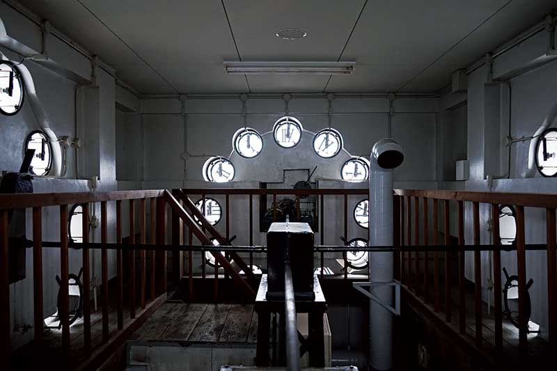 百周年時計台記念館内の「ある扉」から、狭く急な階段を昇ると、時計塔の最上階、文字盤の裏側にたどり着く。部屋の中央には、塔時計の〈心臓〉とも言える駆動装置がある。装置からは4本の黒い金属アームが延び、東西南北4つの壁面に設置された時計の歯車につながる。