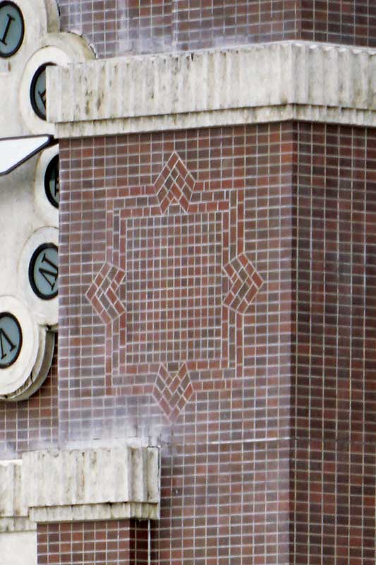壁面を覆うタイルはレンガにも見えるこげ茶色。しかし、目地は縦横一直線。レンガ造は構造上、縦方向の目地が通らないようにレンガを積むのが鉄則だが、時計台はRC造のため構造的な心配はない。RC造であることを暗に示すため、わざとこうした貼り方が選択されたとも考えられる。控えめに組み込まれたモザイク状のタイル装飾も見どころ。