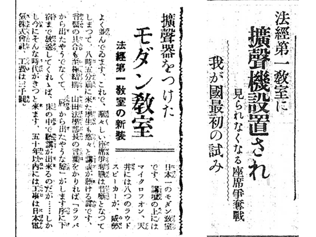 諸説はあるが、日本で初めて講義室に拡声器を使用したのが法経第1教室だと言われている。1929年の学生新聞には、「我が国最初の試み」との文字が踊り、学生の喜びの声が記されている。