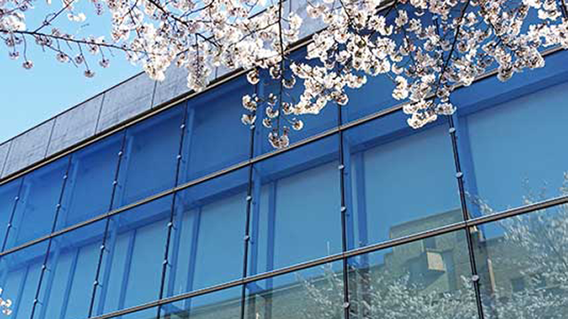 法経第1教室は老朽化により、残念ながら取り壊しが決まった。新たに大型のシンポジウムも開催できる全面ガラス貼りの大ホールが誕生。正面演台の背後のカーテンを開ければ、桜並木越しに法経本館が望める。