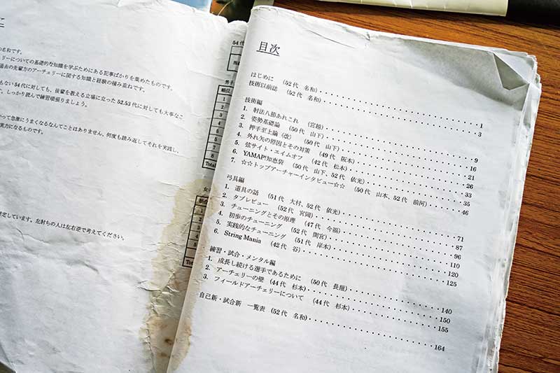 取材した3人を含め、部員のほとんどは大学からアーチェリーを始めた初心者。中には文化部や帰宅部出身の部員もいる。しかし、コーチや監督などは置かず、部員のみで日々切磋琢磨する。練習方法を尋ねると、主務の渡辺理久さんが厚さ5㎝はあろうかという冊子を見せてくれた。「先輩たちが代々残してこられた練習の記録です。体の動かし方から道具のカスタマイズまで、受け継がれてきた知識と経験が詰まっています」。膨大な情報の中から、自らの課題に沿ったものを選び出すのだという。