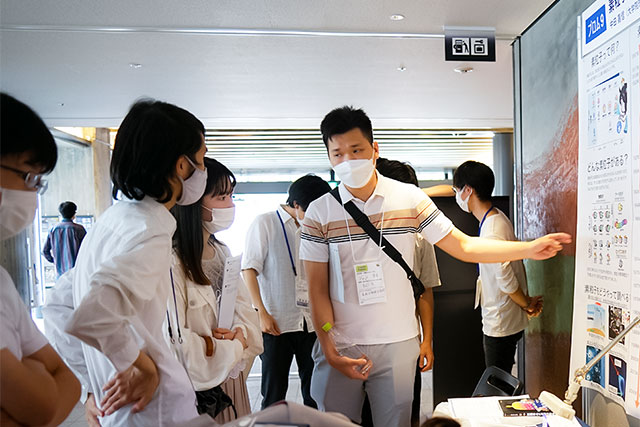 研究者が自作のポスター前で、研究の魅力や意義を紹介。多様な分野から参加した研究者は、約100名。来場者の素朴な質問に、丁寧に熱く答えていました。