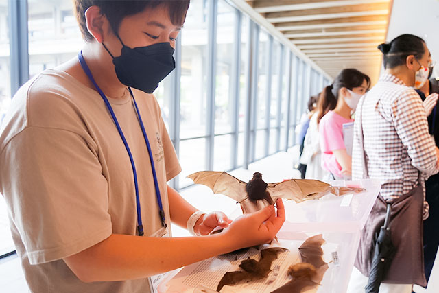 大学院生が見せてくれたのはコウモリ標本。間近で見つめると、羽根の薄さと羽根を支える指の細さに驚く。「この細い指で自由自在に羽根を動かします。獲物を捕らえるのもお手のものですよ」。「伝えたい!」の熱意にあふれる院生の語りに引き込まれる来場者は多数。ブースにはネズミの標本も。