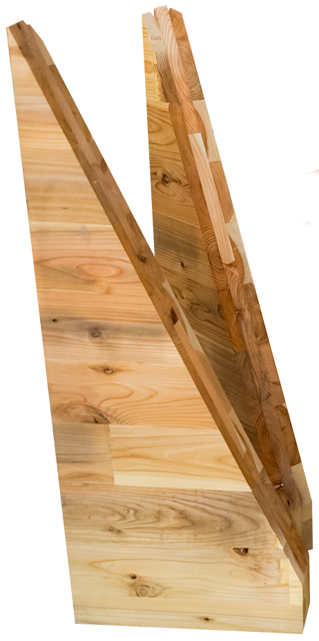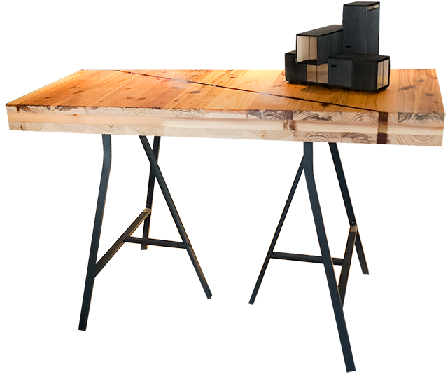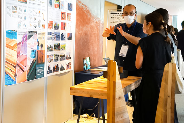 ポスター前には、建築の木質部材CLTの端材2つを組み合わせて造られたテーブル。「これまで端材を使う発想はなく、今は試作の段階。来場者に意見や感想を聞きながら、可能性を探っています」(小見山講師)。接着部は透明のレジンを使っており、切り口の形もデザインに活かされているのが印象的。