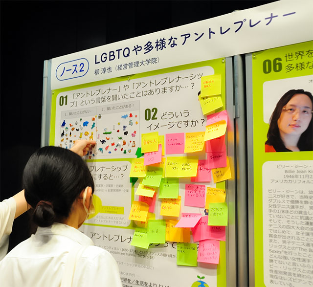「『アントレプレナー』という言葉を知っていますか? どんな人を想定しますか?」の問いに、シールや付箋で回答する来場者。アントレプレナー≒起業家という単語から想定する人物の属性がいかにステレオタイプなのか、多様なアントレプレナーを紹介し、伝えました。