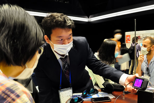 大学院生が企画したブースには、京都大学を目指す高校生の姿が絶えませんでした。VRゴーグルでスーパーカミオカンデの施設内部に入れるなど、研究を知る工夫が盛りだくさん。