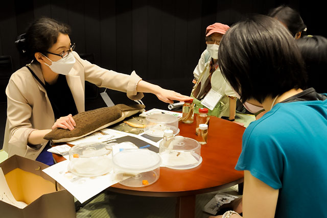 ちゃぶ台の上に並ぶのは、容器に入った生きたナメクジや、ナメクジ標本。ナメクジのぬいぐるみを手に話す宇高助教に、子どもたちから「カタツムリとはどう違う?」、「目は見えているの?」などの質問が次々と。