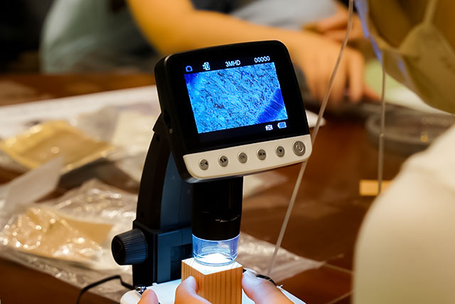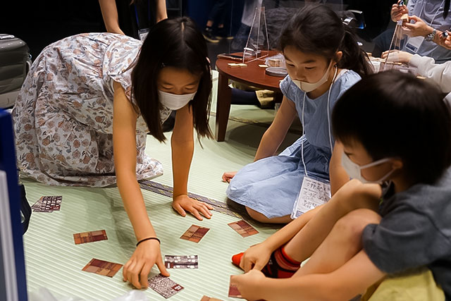 子どもたちの楽しそうな声につられて近づくと、なにやら神経衰弱をしているよう。カードに印刷されたのは木材の木部組織の顕微鏡画像。木材ごとに道管の形や大きさが異なることを遊びながら学ぶことができました。