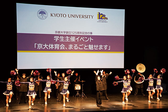 企画・運営を体育会所属の学生たちが担当し、京大体育会の「いま」をアピール。目玉のひとつは体育会所属の全55部による動画上映。汗のしたたる試合の様子、黙々と励む練習風景、仲間と過ごす時間……創意工夫を凝らした動画には、各部の色が存分に発揮されていました。体育会OBと現役学生による座談会には、森田鉄兵さん(京都ハンナリーズ 代表取締役社長〈当時〉)、新実彰平さん(関西テレビ)が出演。部活と勉強の両立など、思い出話に花を咲かせました。イベントの最後には、応援団が久々となる観客の前での演舞を披露。熱のこもる圧巻のパフォーマンスで来場者を魅了しました。