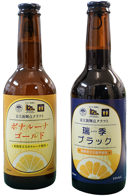 限定販売された「京大新輝点クラフト」。京大農場と広島県、高知県とが10年をかけて育てた新品種のブンタン「ボナルーナ」と「瑞季」を使った特別品。