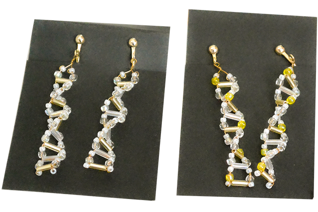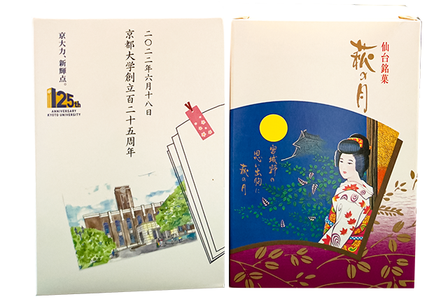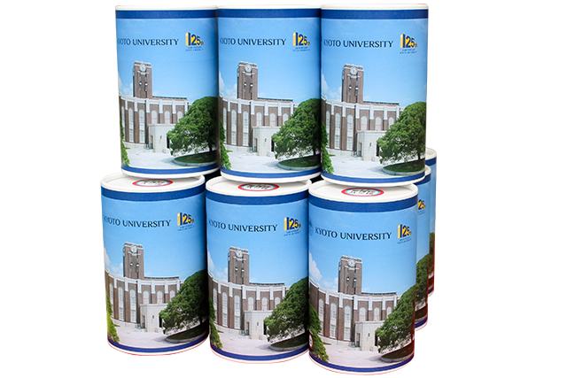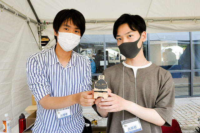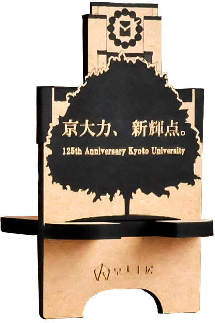 テントを訪ねて、スタンプを集めると、時計台とクスノキをあしらった木製のスマホスタンドをプレゼント! 先着50名限定の景品を企画・制作したのは、京大らしいユニークなグッズを制作する京大工房。使用場面を想定した角度の設計、立体感の演出など、細部のこだわりが光る。「2022年という時代を反映したくて、現代らしいデバイスであるスマートフォンのスタンドに決めました」。テントには、円周率やDNAの二重らせんなどのモチーフをあしらったグッズが並んだ。