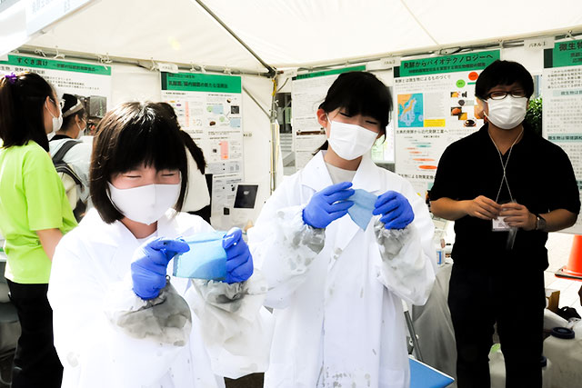 好気発酵と嫌気発酵という2つの発酵が作用する藍染を体験。(農学研究科応用生命科学専攻発酵生理及び醸造学研究室)