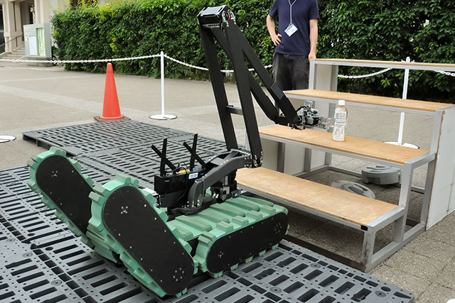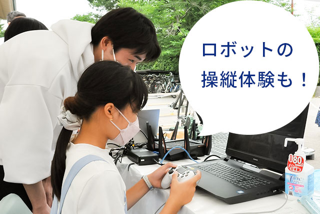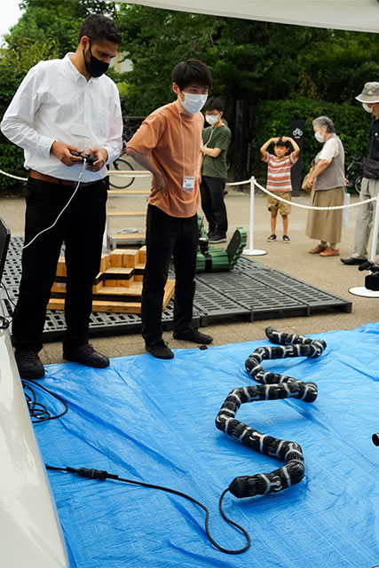 世界大会で優勝に輝いたレスキューロボットの後継機「FUHGA3」、本物のヘビさながらの動きではしごを昇る「龍神」などを間近で見学。「新作の『YAGURA』も持ってきました。縦横ともに約38cmの小さな機体ですが、アームは2.6mまで伸びます。高所や狭所の作業や点検に最適です。実際に見て、体験して、ロボット工学への関心を深めてほしいですね」(松野文俊教授)。