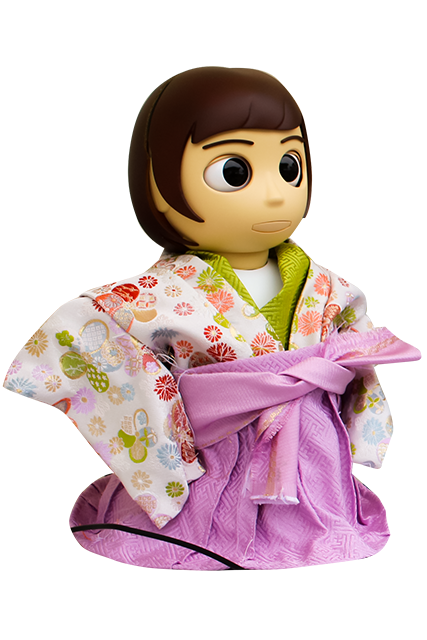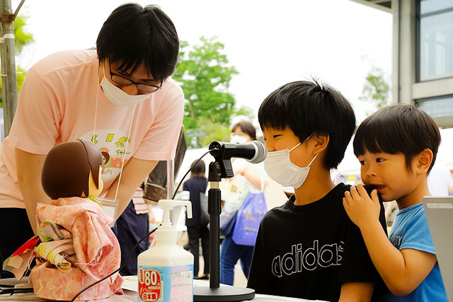 ひっきりなしに子どもたちが訪れていたのは傾聴対話ロボット「きくロボ」との対話体験。適切なタイミングでの相づちや、会話内の重要な単語を捉えることができる。「人型ロボットならではの親しみやすさ、話し相手としての温もりを感じてもらえたら」(研究室の大学院生)。