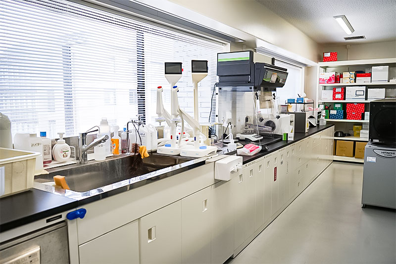 実験室の配置や備品の選択は牧野准教授が担当。寸法を測り、垂直にラインが揃うように設置されたデスクやシンクなど、使いやすさ・片付けやすさへのこだわりが垣間見られる
