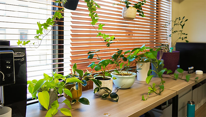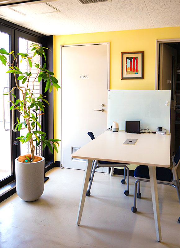 2020年11月に引っ越したばかりの新しい研究フロアで研究に励む。殺風景にならないよう、レモンイエローの壁に合う観葉植物があちこちに置かれている