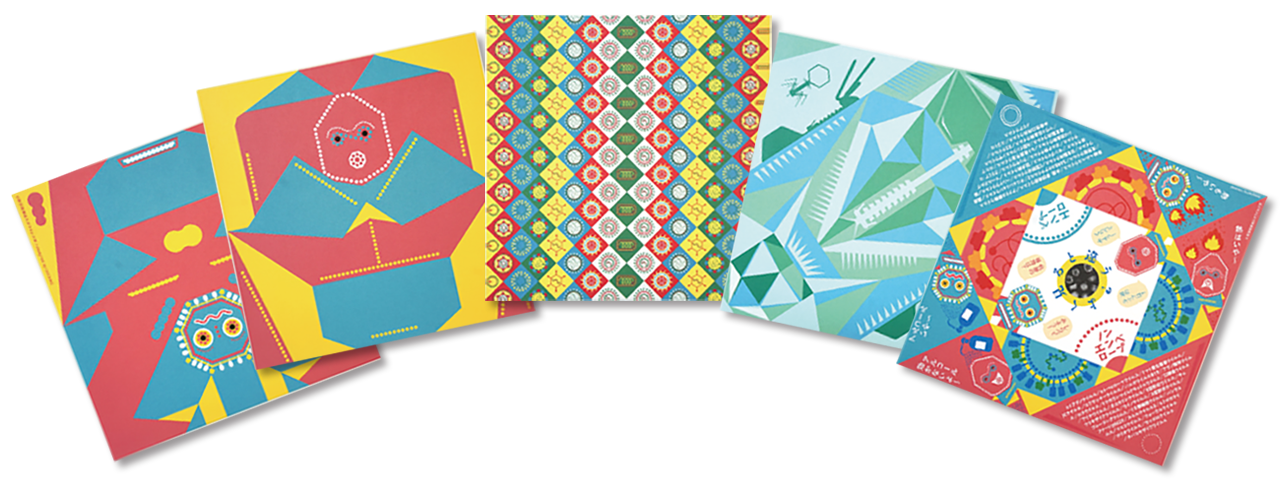 グラフィック折り紙を得意とするデザインユニットCOCHAEと共に、2種類のウイルスを「ウイちゃん」と「ルースくん」としてキャラクター化。「何よりもかわいさを優先」との言葉通り、従来のウイルスのイメージとは異なるデザインに仕上げた。「ウイルスの擬人化は避けるべきという暗黙のルールがあると思っていましたが、コロナ禍の影響で多くの人がウイルスに関心を持つ今こそやってみるべきだと挑戦しました」。キャラクターはどちらも親しみやすい見た目だが、「ウイちゃん」はエンベロープウイルス、「ルースくん」はノンエンベロープウイルスをベースに、タンパク質や核酸のモチーフを使って顔のパーツを描くなど、学術的な含蓄の深さはまさに折り紙つき。