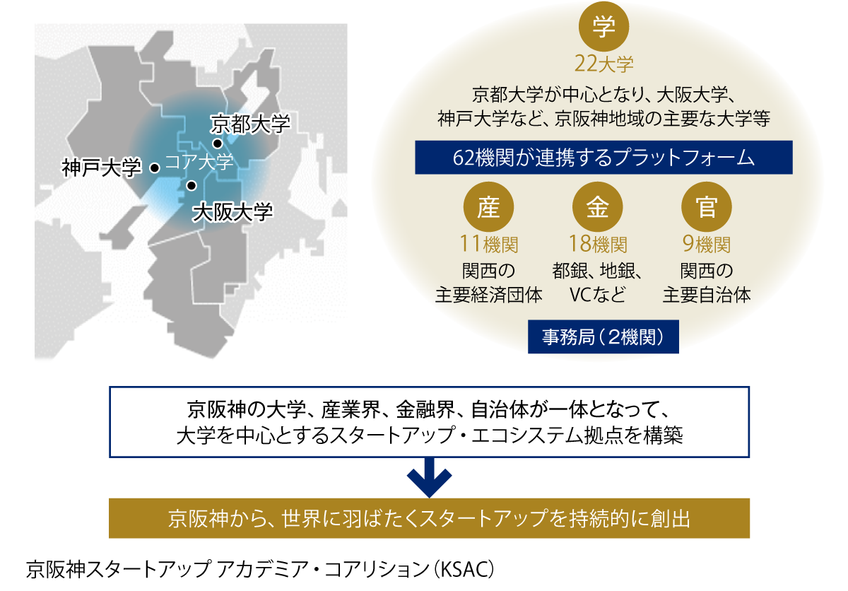 京阪神の大学や産業界、金融界、自治体など、50以上の機関が参画する「京阪神スタートアップ アカデミア・コアリション」(KSAC)が2021年から本格始動していて、私はその代表を務めています。1校だけで取り組むよりも、やはり相乗効果が生まれる手ごたえがあります。
