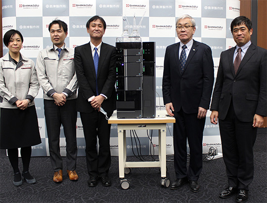 高速液体クロマトグラフの新製品を薬学研究科の石濱泰教授との共同研究をもとに設計・開発。2022年の発表会見での一枚。ほかにも乳房専用PET装置の研究開発など、創業時から京都大学との共同でイノベーションを創出し続けている