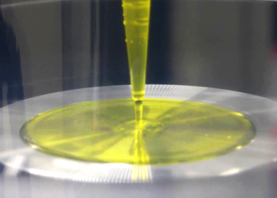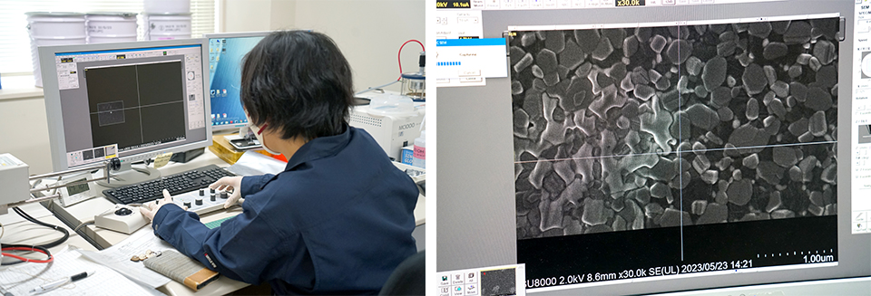 できあがったペロブスカイト層は顕微鏡で確認し、表面のなめらかさなどをチェック