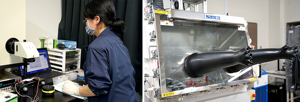 左/太陽光を模した光を当てて、できあがったペロブスカイト太陽電池の発電効率を調査右/酸素や水に不安定な化合物の実験に欠かせないグローブボックス。外気に一切触れずに作業ができる