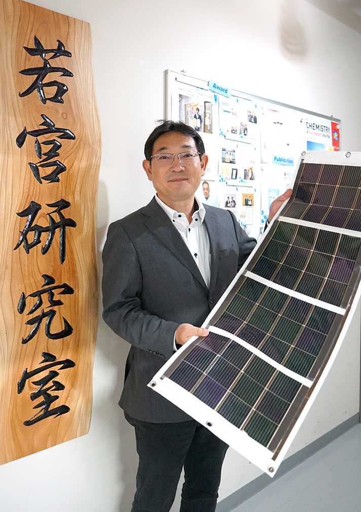 なかでも、大きな期待が寄せられるのがペロブスカイト太陽電池。「フィルムや薄いガラスの上に、ペロブスカイト結晶構造を持つ化合物を塗布した太陽電池で、薄くて軽くて、ぐにゃりと曲げることもできる。さらに、太陽光をエネルギーに変換する発電効率も高いのです」。そう語るのは、第一線で研究を進める若宮教授だ。